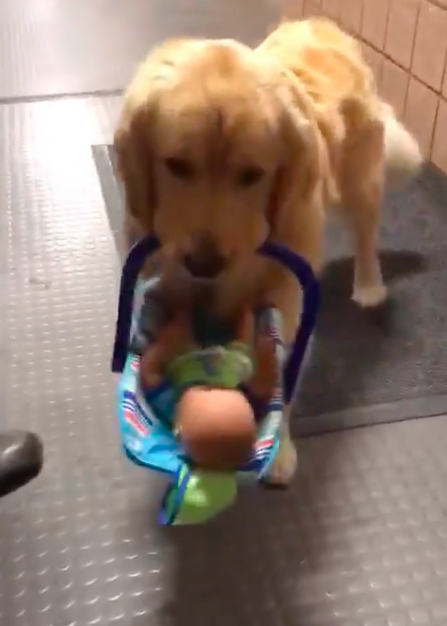 Source: static.boredpanda.com In a video shared on the police department's facebook wednesday, the golden retriever can be seen happily walking around a baby doll in a small carrier along a corridor.